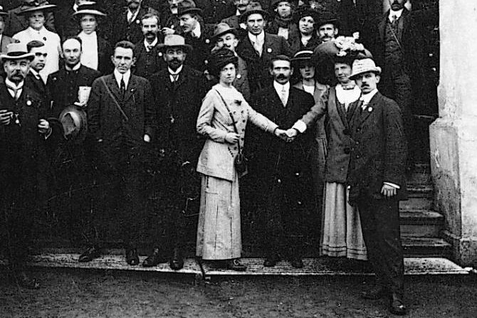 In 1907, Zetkin initiated the first of the International Socialist Women’s Conference to immediately precede the meeting of the Second International, where representatives from left parties gathered from across the world. Zetkin and Kollontai used the occasion to argue against campaigns for partial women’s suffrage and they won the conference to support a resolution stating: ‘socialist parties of all countries have a duty to struggle energetically for the introduction of universal suffrage for women.’[3]